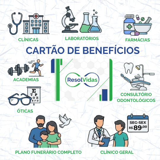Com o Cartão Resolvidas, você economiza de verdade no dia a dia. Depois da adesão, é só apresentar o cartão nos parceiros e garantir descontos de 5% a 90% em consultas, exames, farmácias, dentistas, academias, óticas e muito mais.
